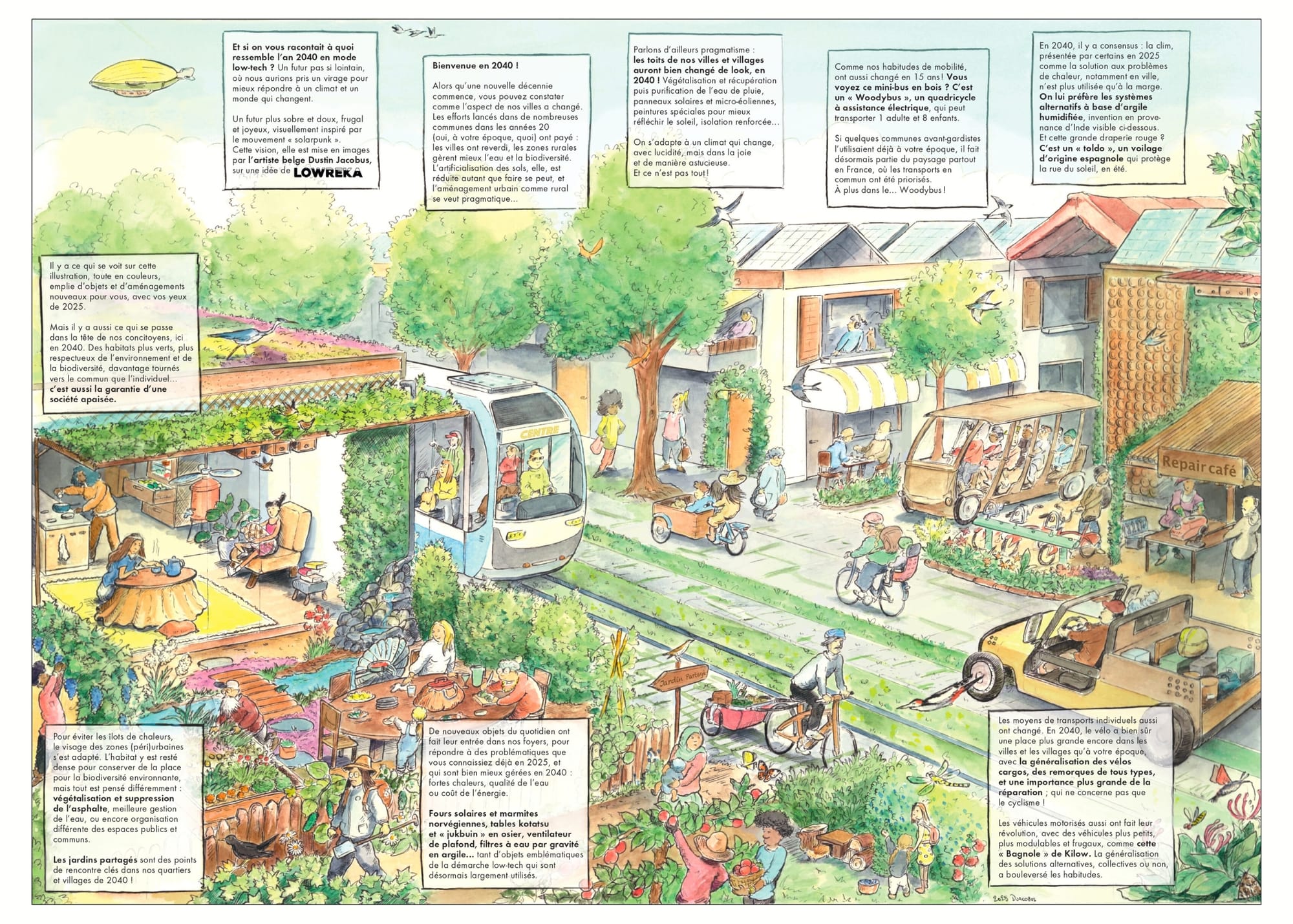 Ensuite, parce qu'elle monopolise des imaginaires positifs, qui nous permettent d'envisager un avenir plus radieux que ce que le contexte du moment pourrait nous laisser penser. J'ai ainsi eu le plaisir de mener, avec le dessinateur solarpunk Dustin Jacobus, un travail prospectif dont vous trouverez le résultat ci-dessous. Je vous laisse découvrir plus de détails ici, si le sujet vous plaît.